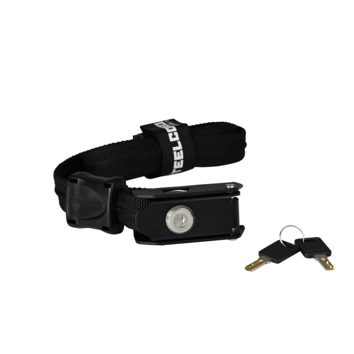 Steel core belts have a 7/19 galvanized steel cable braided in the center and covered with a cut-resistant SEW fabric made with a proprietary blend of steel and fibers. The straps have a powder-coated aircraft aluminum buckle assembly for corrosion resistance. The locks are custom made using a double-butted key and a pick resistant design.